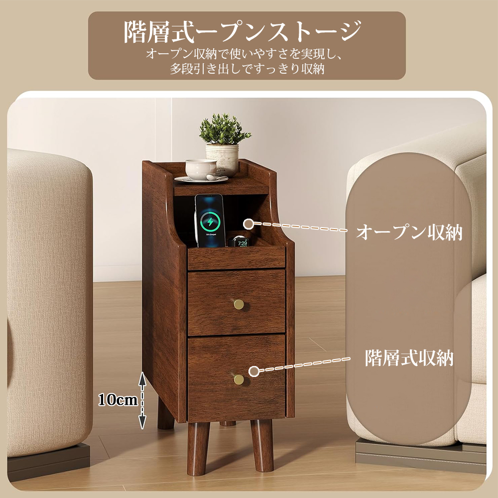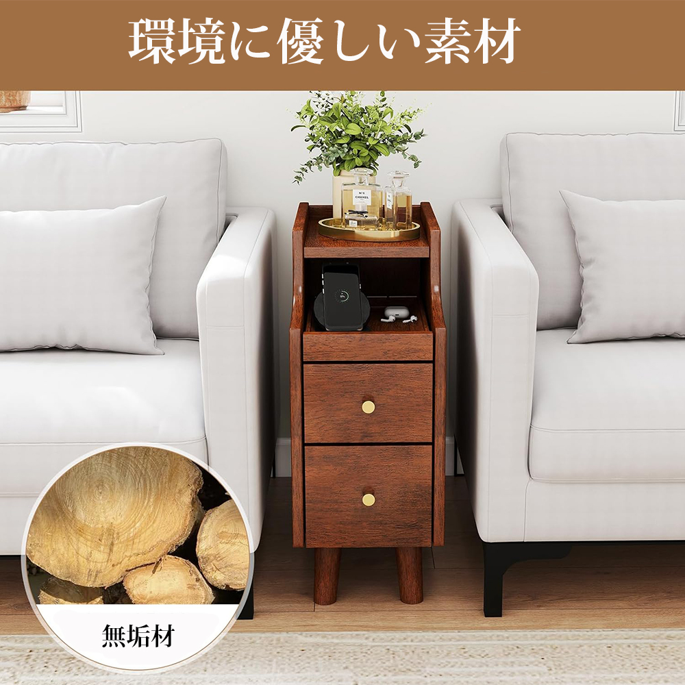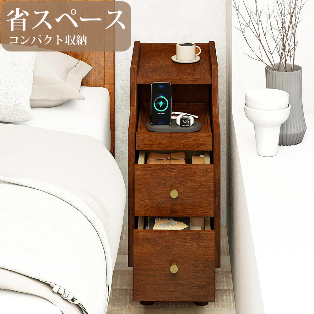 ナイトテーブル スリム サイドテーブル ベッドサイドテーブル 引き出し付き ベッド横 木製 省スペース 配線孔つき おしゃれ 無垢材 小物収納 コンパクト 寝室 ベッド周り収納 コーヒーテーブル 完成品 組立不要