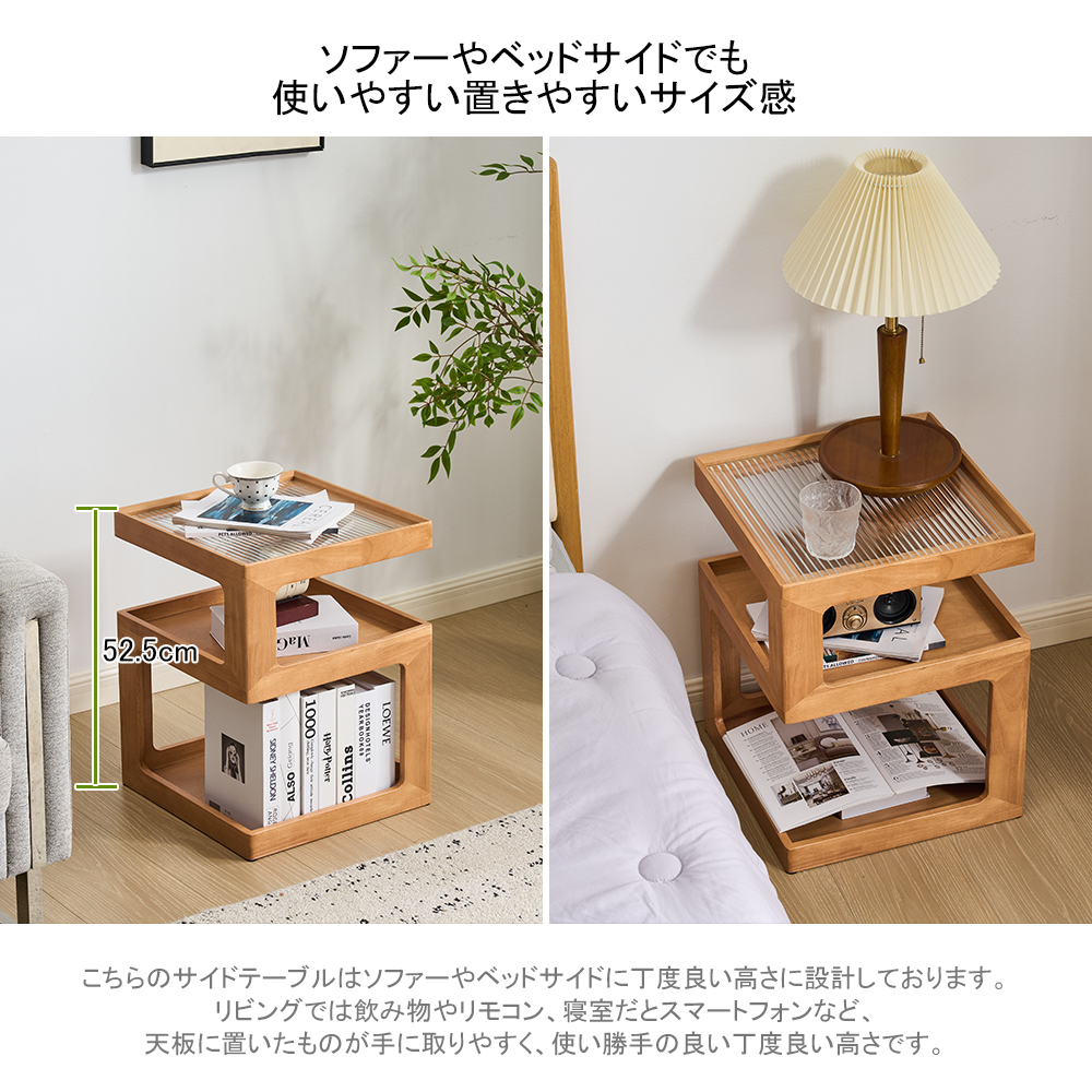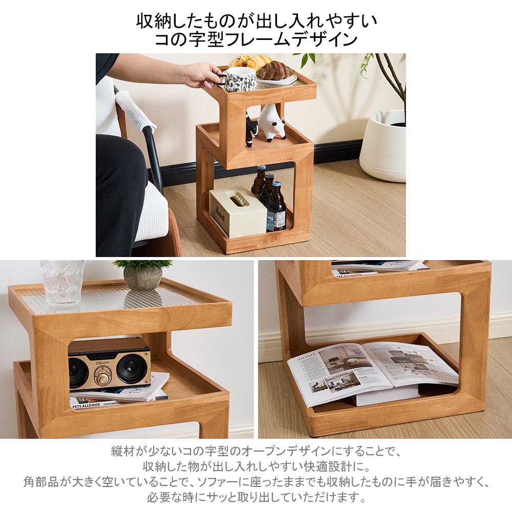 ナイトテーブル ガラス天板 ベッドサイドテーブル 3段 多機能 収納ラック 四角 テーブル ソファサイドテーブル S字ラック ベッド横 ソファー横 電話台 完成品